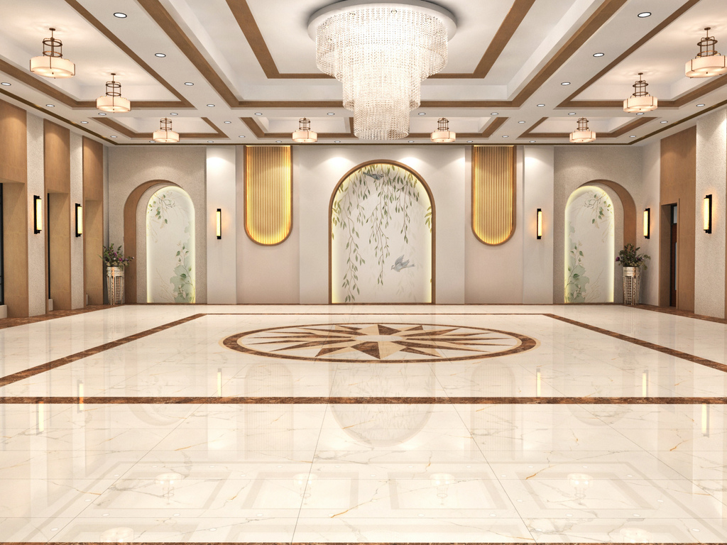 A grand, interior-designed banquet hall with a capacity of approximately 300 people, ideal for large gatherings, traditional performances, weddings, and major community events.